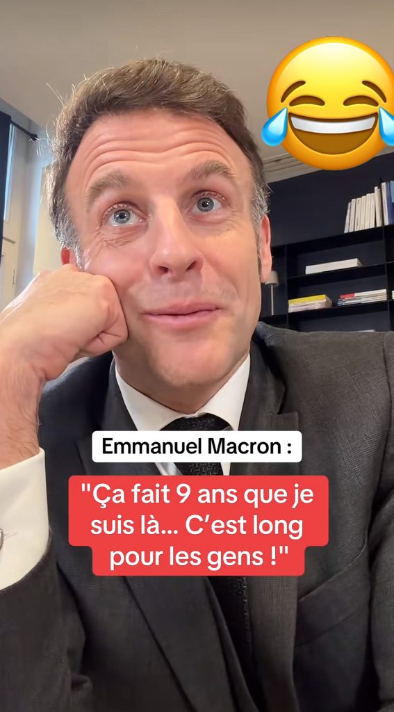 Le texte inscrit sur l’image est sans équivoque : « Emmanuel Macron : « Ça fait 9 ans que je suis là… C’est long pour les gens ! » ». Bien entendu, il s’agit d’un détournement. Le président français a été élu pour la première fois en 2017, ce qui, au moment où ce type de contenu circule, ne fait pas encore neuf ans. Cependant, la citation joue sur une vérité perçue : le sentiment de stagnation ou la fatigue démocratique ressentie par une partie de la population après plusieurs années de mandat.